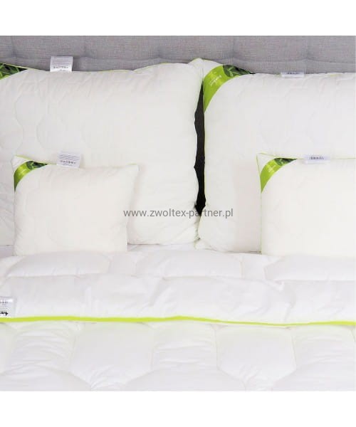 Kołdra typu 4 PORY ROKU. Są to dwie spinane ze sobą kołdry, z których jedna jest kołdrą letnią, a druga to kołdra całoroczna – po ich spięciu napami otrzymujemy bardzo ciepłą kołdrę zimową. Wypełniona materiałem DreamFill z drobnych spiralnie skręconych włókien poliestrowych pokrytych silikonem, dzięki czemu są bardziej puszyste oraz dłużej zachowują swój pierwotny kształt. Włókno posiada bardzo dobry współczynnik termoizolacji, zapewniając ciepło przy zachowaniu niskiej wagi wyrobu. Optymalna cyrkulacja powietrza pozwala ciału oddychać i optymalizować temperaturę podczas snu. Materiał pokryciowy to innowacyjna tkanina, łącząca najlepsze cechy bawełny i bambusa. Bawełna zapewnia miękkość, a bambus nadaje tkaninie aksamitności oraz właściwości antybakteryjnych i antygrzybicznych.
