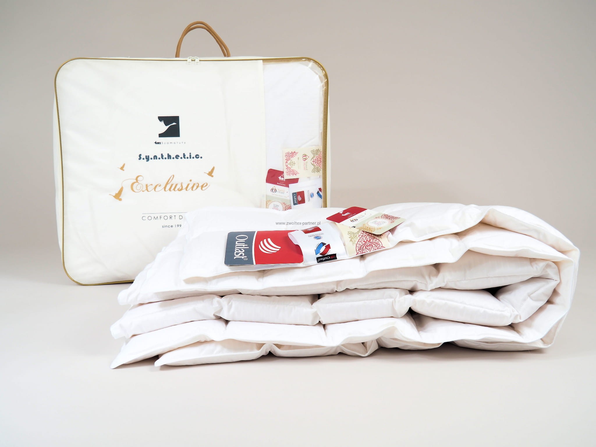 Absolutna nowość – ekskluzywne puchowe kołdry i poduszki pokryte termoaktywną tkaniną OUTLAST. Kołdra zapewnia komfort puchowych produktów: miękkość, delikatność, idealną cyrkulację powietrza i wchłanianie nadmiaru wilgoci. Dodatkowo tkanina pokryciowa zapewnia właściwości termoregulacyjne, zapewniając zawsze przyjemna, optymalną temperaturę w granicach 37 st. C. Tkanina posiada stylowy, pasiasty wzór. Jest mięciutka, otulająca i komfortowa. Możliwość prania w pralce w temp do 40 st. C., ułatwia utrzymanie wyrobów w czystości. Wyjątkowo czyste i bezwonne wypełnienie w postaci najwyższej jakości polskiego puchu gęsiego 100% klasy ekstra poddanego procesowi uszlachetniania EEC - zapewnia bezpieczeństwo i długi okres żywotności produktu.