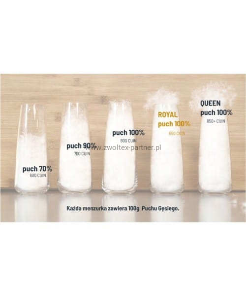 Wypełnienie: polski gęsi puch 100% eksportowy o niesamowitej wyporności 850 cuin. Ten rygorystycznie selekcjonowany puch jest najdoskonalszym surowcem możliwym do uzyskania. Pozyskiwany jest wyłącznie z okolic podbrzusza gęsi hodowanych metodami ekologicznymi. Cechuje go najwyższa wyporność i sprężystość, zapewniając wyrobom nieziemską miękkość i lekkość. Ekskluzywnymi cechami wyrobów możemy cieszyć się przez dłuższy okres, dzięki zastosowaniu puchu ekstra jakości poddanego profesjonalnej obróbce. Wypełnienie poddane procesowi EEC, który zapewnia lepsze właściwości puchowi oraz wyjątkową czystość i brak zapachu. Puch przygotowany zgodnie z normą: PN-EN 12934 zawierającą informacje o jakości puchu. Oraz normą: PN-EN 12935 tyczącą się czystości wypełnienia.