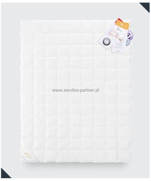 Szycie i wykończenie: kołdra o budowie tradycyjnej - szyta w technologii zimnego szwu zapewniającemu lepszą cyrkulację powietrza. Kratki są szczelnie zamknięte uniemożliwiając przemieszczaniu się wypełnianiu pomiędzy komorami. Wyroby w kolorze białym, wykończone białą bizą.