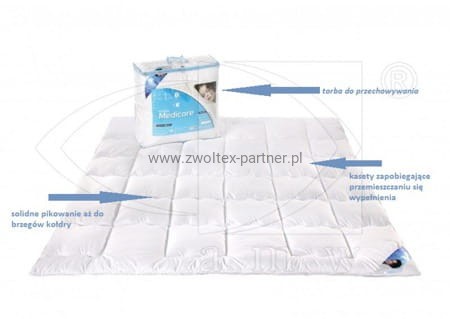 Kołdra MDICARE jest wyjątkową odmianą kołdry, przeznaczoną dla osób o skłonnościach alergicznych. Ten wyrób charakteryzuje się doskonałą przepuszczalnością powietrza i wilgoci. Utrzymuje temperaturę ciała na stałym poziomie, a zarazem daje możliwość odpoczynku dla ludzkiego organizmu w optymalnych warunkach.