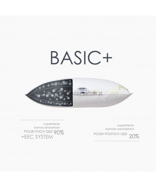 Kolekcja BASIC+ to kolekcja wypełniona puchem gęsim 70% o podwyższonej jakości. Wyroby zostały pokryte miękkim inletem bawełnianym o gramaturze 130 g/m2.