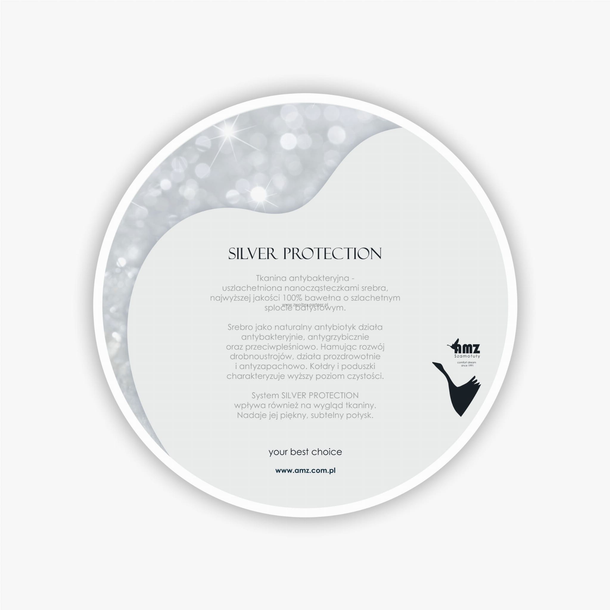 Tkanina została uszlachetniona systemem SILVER PROTECTION - pokryta jest drobinkami srebra, które działają antybakteryjnie, antygrzybicznie oraz antypleśnowo. Poza zapewnieniem dodatkowego bezpieczeństwa system ten nadaje tkaninie dodatkowy połysk.