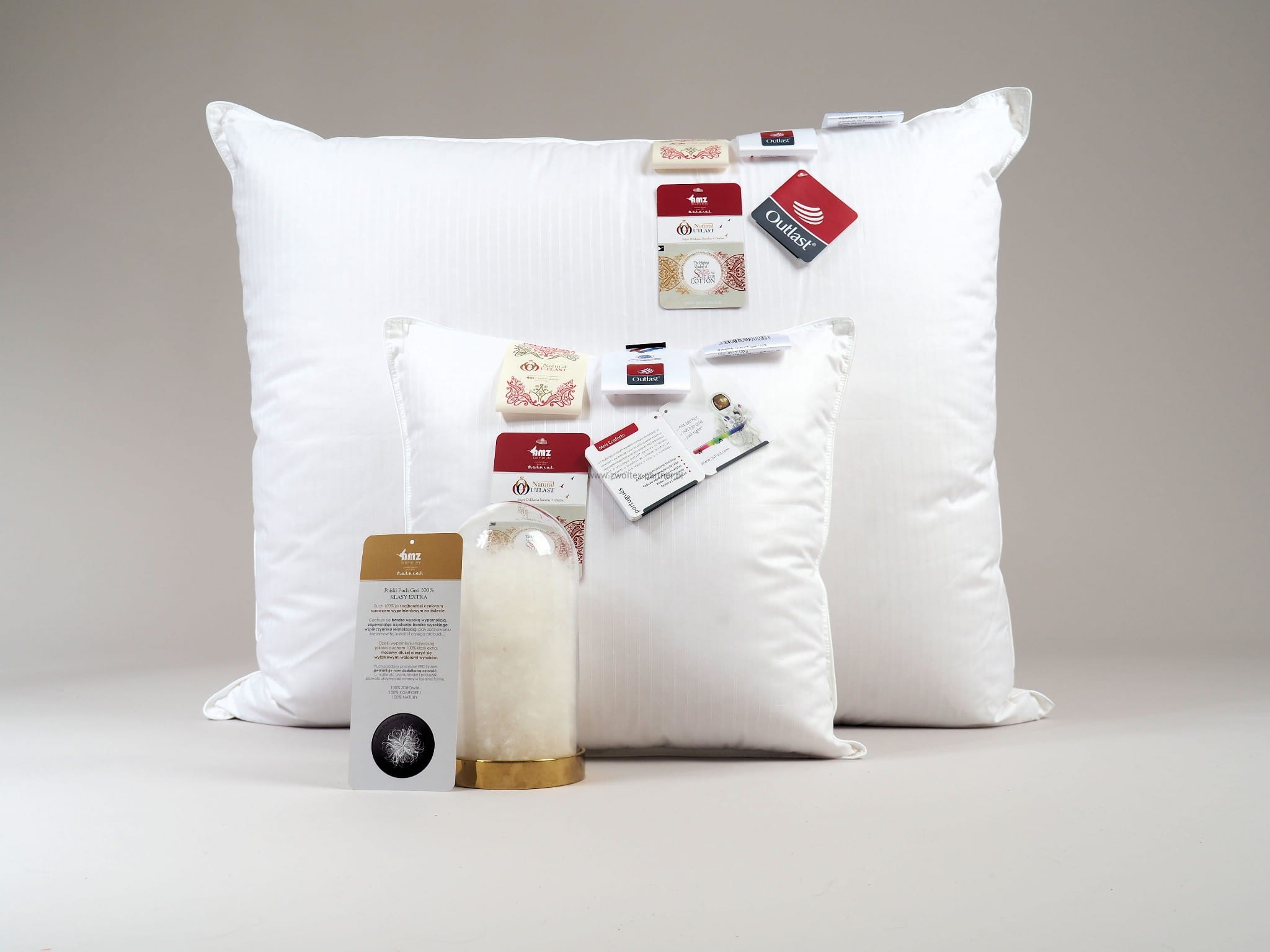 Absolutna nowość – ekskluzywne puchowe kołdry i poduszki pokryte termoaktywną tkaniną OUTLAST. Poduszka zapewnia komfort puchowych produktów: miękkość, delikatność, idealną cyrkulację powietrza i wchłanianie nadmiaru wilgoci. Dodatkowo tkanina pokryciowa zapewnia właściwości termoregulacyjne, zapewniając zawsze przyjemna, optymalną temperaturę w granicach 37 st. C. Tkanina posiada stylowy, pasiasty wzór. Jest mięciutka, otulająca i komfortowa. Możliwość prania w pralce w temp do 40 st. C., ułatwia utrzymanie wyrobów w czystości. Wyjątkowo czyste i bezwonne wypełnienie w postaci najwyższej jakości polskiego puchu gęsiego 100% klasy ekstra poddanego procesowi uszlachetniania EEC - zapewnia bezpieczeństwo i długi okres żywotności produktu.