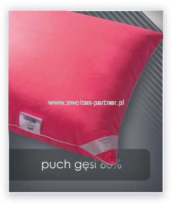 Wypełnienie: polski gęsi puch 60% (pozostałe 40% to miękkie, drobne piórka puchowe). Użyty puch jest surowcem wysokiej jakości, posiadającym wysoką wyporność. Dzięki czemu produkty są lekkie przy zachowaniu wysokiego współczynnika termoizolacji oraz niesamowicie sprężyste. Wypełnienie przygotowane jest zgodnie z normami europejskimi i jest całkowicie bezpieczne.