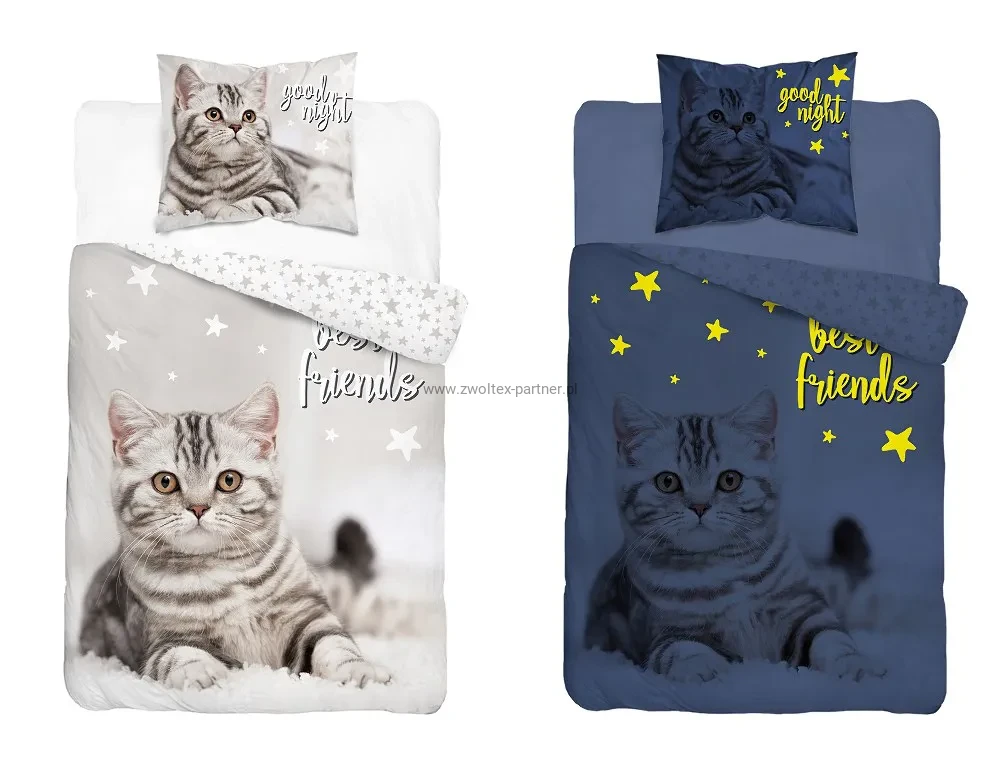 Pościel bawełniana 160x200 KOTEK SZARY Z GWIAZDKAMI -świecąca w ciemności