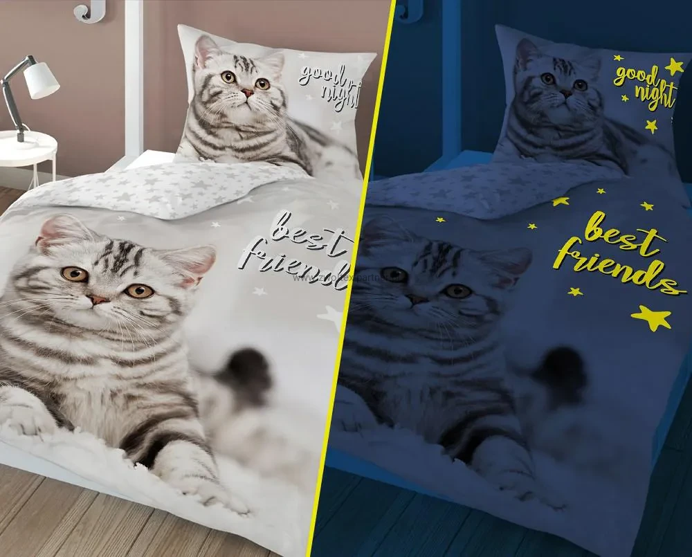 Pościel wystawiona na światło dzienne lub sztuczne uzyskuje efekt świecenia w ciemności. Długość efektu świecenia jest zależna od czasu ekspozycji na światło. Ze względu na określoną trwałość farby, efekt świecenia w ciemności może stopniowo się osłabić po kilku praniach.