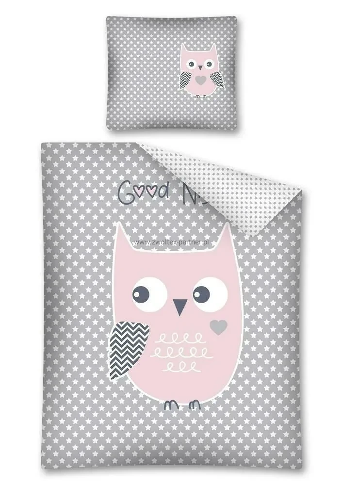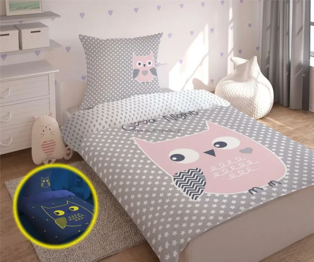 Pościel bawełniana 160x200 SOWA gwiazdki różowa szara - świecąca w ciemności